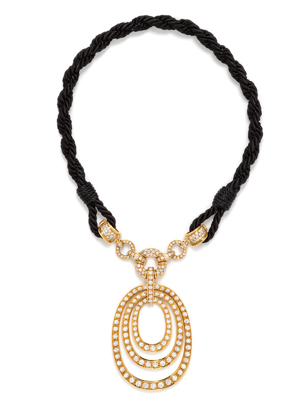 Consisting of yellow gold links containing numerous round brilliant cut diamonds weighing approximately 13.00 carats total, suspended from a black cord necklace.