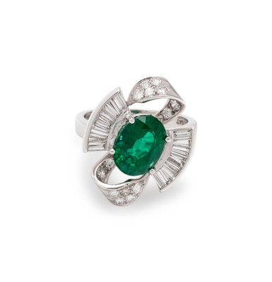 Containing one oval mixed cut emerald measuring approximately 10.60 x 7.90 x 5.70 mm, 14 straight and tapered baguette cut diamonds and 15 round brilliant cut diamonds weighing approximately 1.50 carats total. Mounted in platinum.