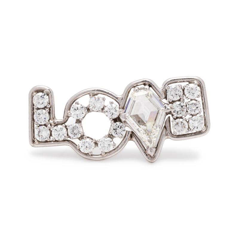 Containing one cut-corner triangle step cut diamond weighing approximately 1.50 carats and 17 round brilliant cut diamonds weighing approximately 1.20 carats total.