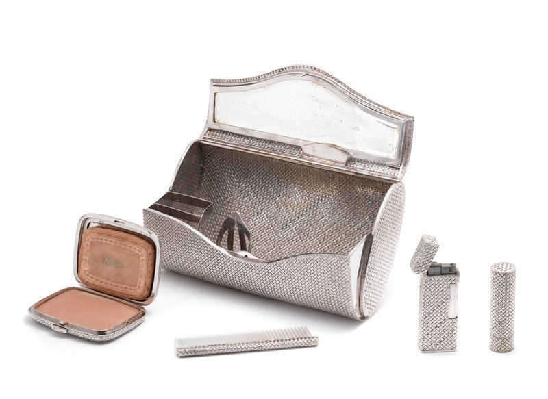 Consisting of a textured mesh clutch, the leading edge of hinged closure containing 69 round brilliant cut diamonds weighing approximately 2.90 carats total, with interior compartments containing textured mesh comb, lighter, lipstick case and compact.