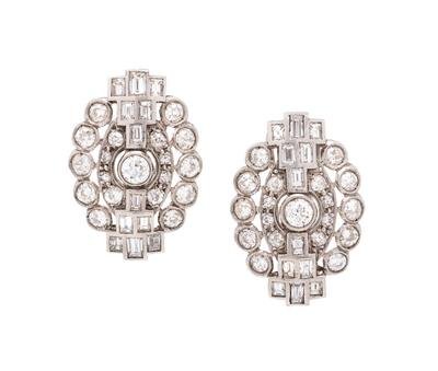 Containing 38 old European, old mine and single cut diamonds weighing approximately 1.90 carats total and 24 baguette cut diamonds weighing approximately 1.10 carats total, posts with clip backs. Mounted in platinum. Circa 1930.