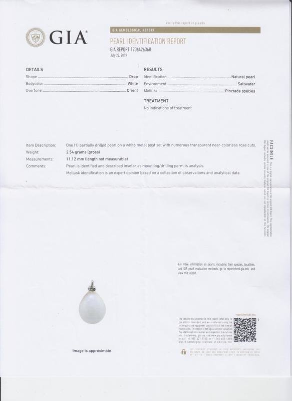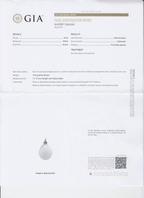 GIA, 2019, Report number 1206426368, Natural pearl, Saltwater, Pinctada species, drop shape, White color, Orient overtone