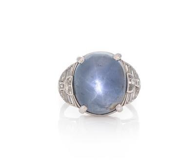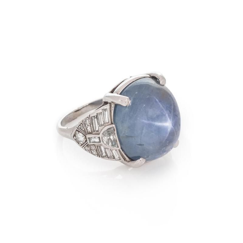 Containing one oval shape cabochon cut star sapphire measuring approximately 16.30 x 14.00 x 10.90 mm and numerous half moon, baguette, single and round brilliant cut diamonds weighing approximately 1.00 carat total. Mounted in platinum.