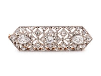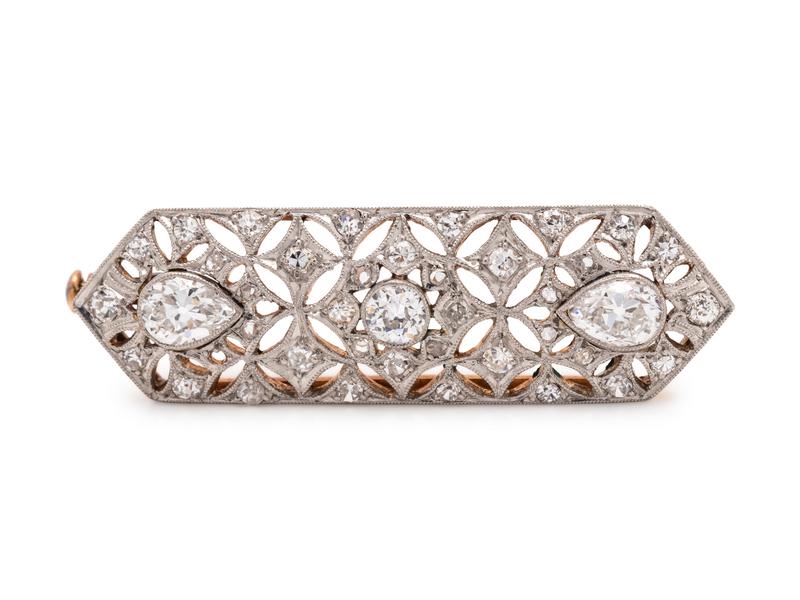 Containing one old European cut diamond weighing approximately 0.15 carat, two pear shape diamonds weighing approximately 0.50 carat total and 36 old European cut, rose cut and single cut diamonds weighing approximately 0.70 carat total. Mounted in platinum topped gold.