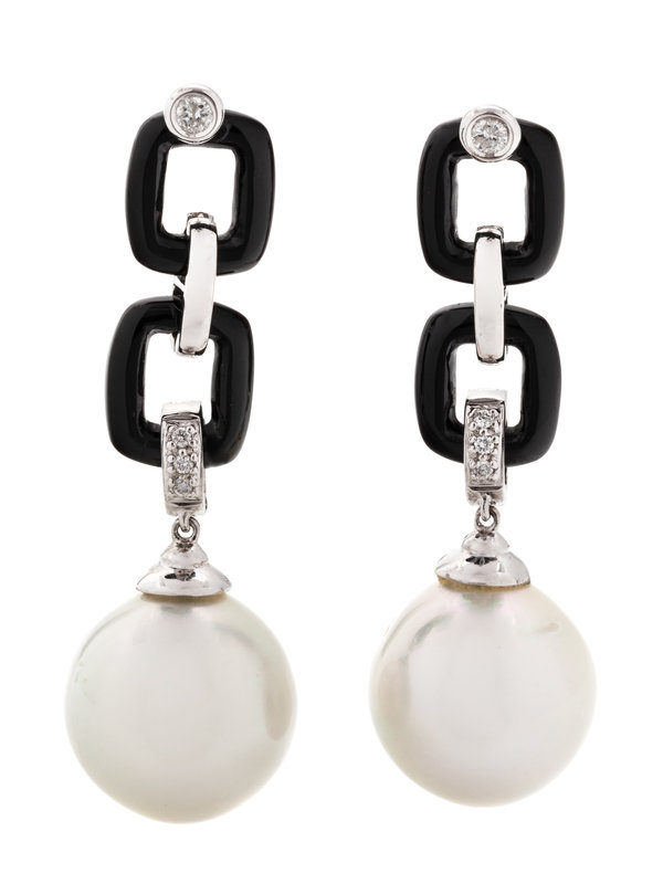 Consisting of four rectangular links surmounted with onyx, eight round brilliant cut diamonds weighing approximately 0.20 carat total and suspending two pearls measuring approximately 16.00 mm in diameter. Mounted in white gold.
