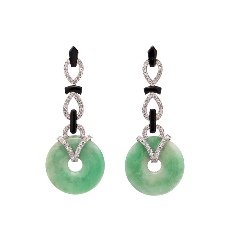 Containing numerous round brilliant cut diamonds weighing approximately 0.55 carat total, with carved onyx accents and suspending two jade bi measuring approximately 18.60 mm in diameter. Mounted in white gold.