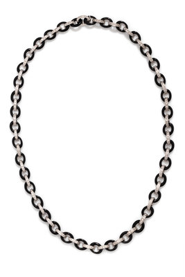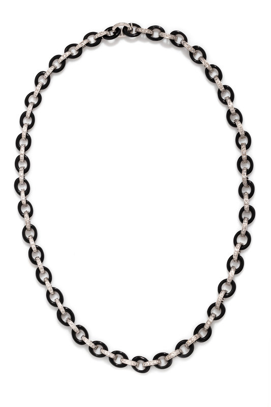 Consisting of oval shape links surmounted with onyx, with connector links containing numerous round brilliant cut diamonds weighing approximately 1.90 carats total. Mounted in white gold.