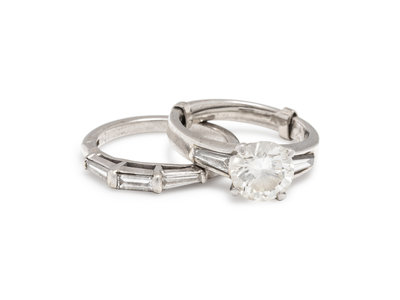 Consisting of a ring containing one round brilliant cut diamond weighing 2.34 carats and two tapered baguette cut diamonds weighing approximately 0.30 carat total, together with a ring containing three baguette cut diamonds weighing approximately 0.50 carat total. Mounted in platinum.