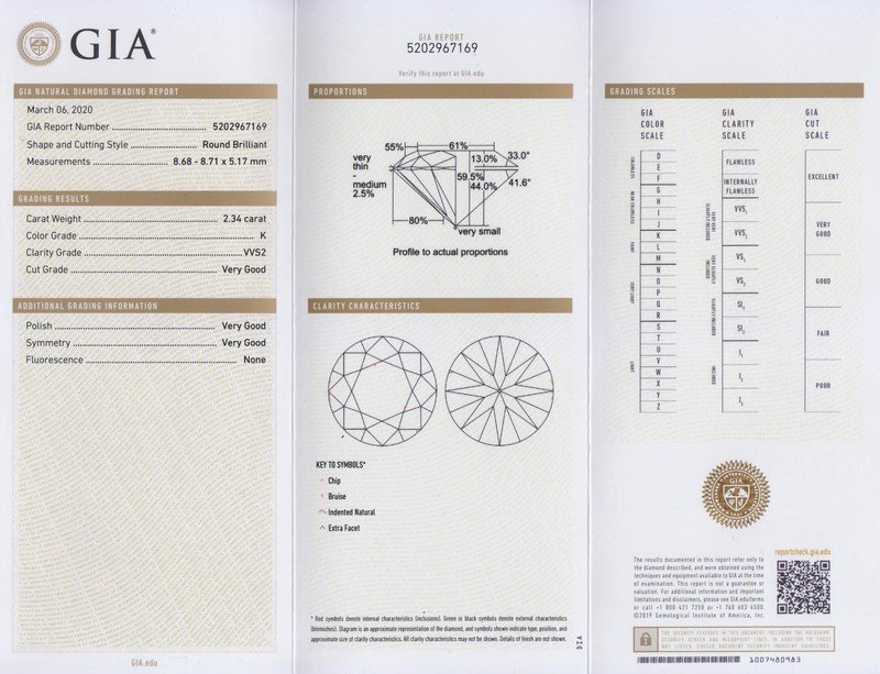 GIA, 2020, Report number 5202967169, 2.34 carats, K color, VVS2 clarity, No fluorescence