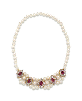 RUBY, DIAMOND AND CULTURED PEARL NECKLACE