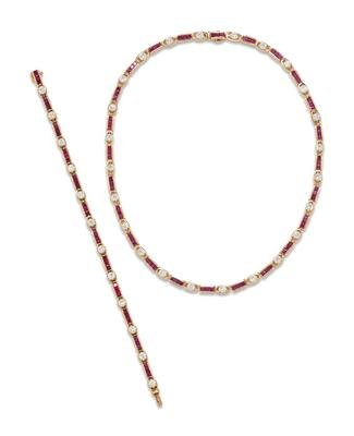Consisting of a necklace containing 24 round brilliant cut diamonds weighing approximately 5.25 carats total and 72 square step cut rubies, together with a bracelet containing 12 round brilliant cut diamonds weighing approximately 2.50 carats total and 36 square step cut rubies. Mounted in yellow gold.