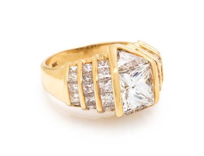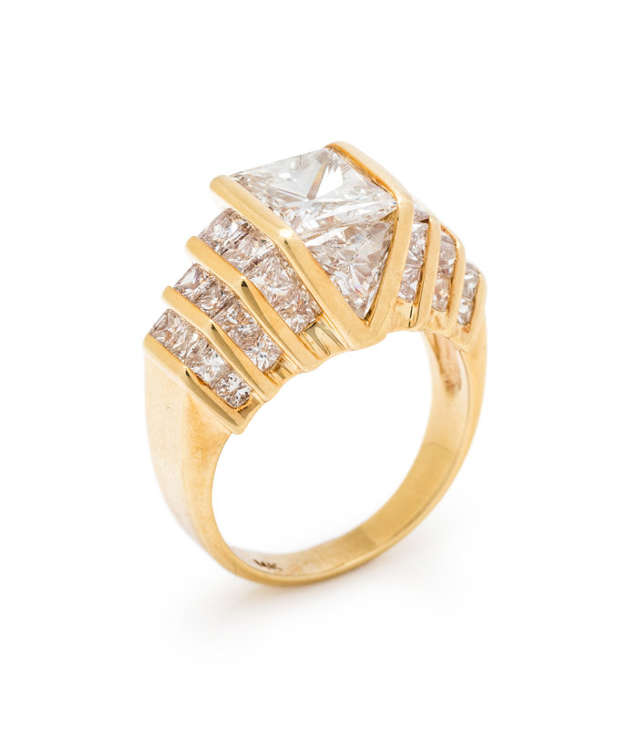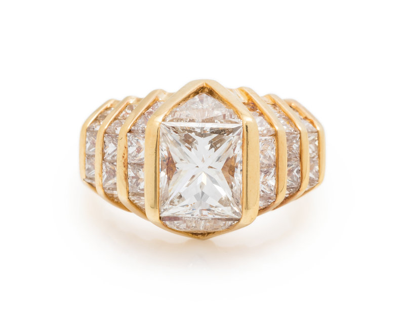Containing one princess cut diamond weighing approximately 2.40 carats, two triangular brilliant cut diamonds weighing approximately 1.20 carats total and 36 princess cut diamonds weighing approximately 2.20 carats total. Mounted in yellow gold.