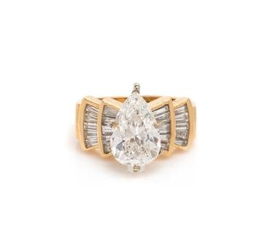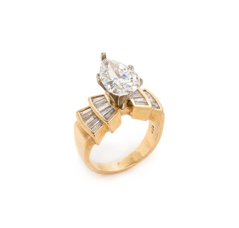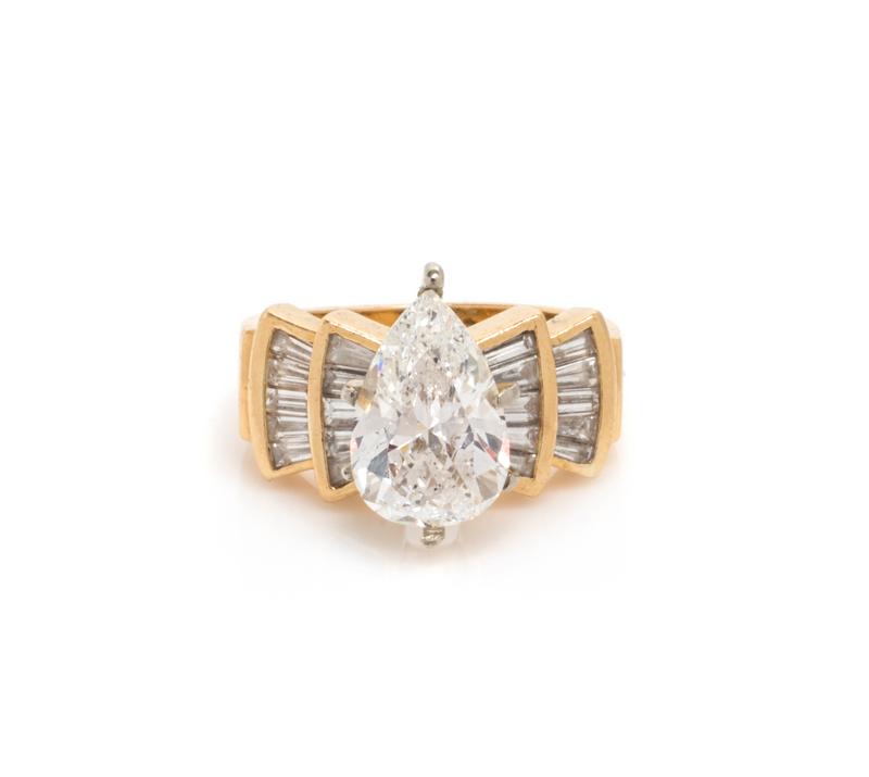 Containing one pear shape brilliant cut diamond weighing 3.01 carats and 20 tapered baguette cut diamonds weighing approximately 1.00 carat total. Mounted in yellow gold.