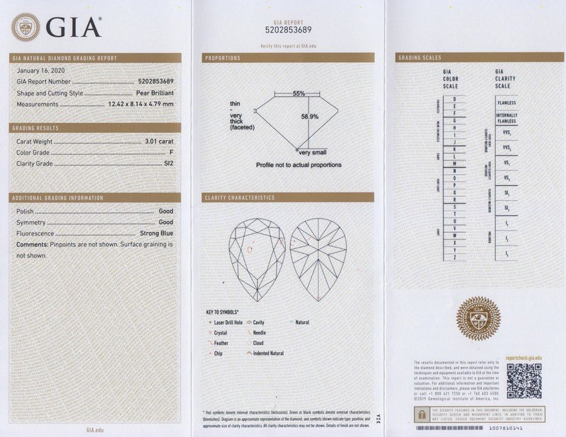 GIA, 2020, Report number 5202853689, 3.01 carats, F color, SI2 clarity with Laser Drill Hole, Strong Blue fluorescence