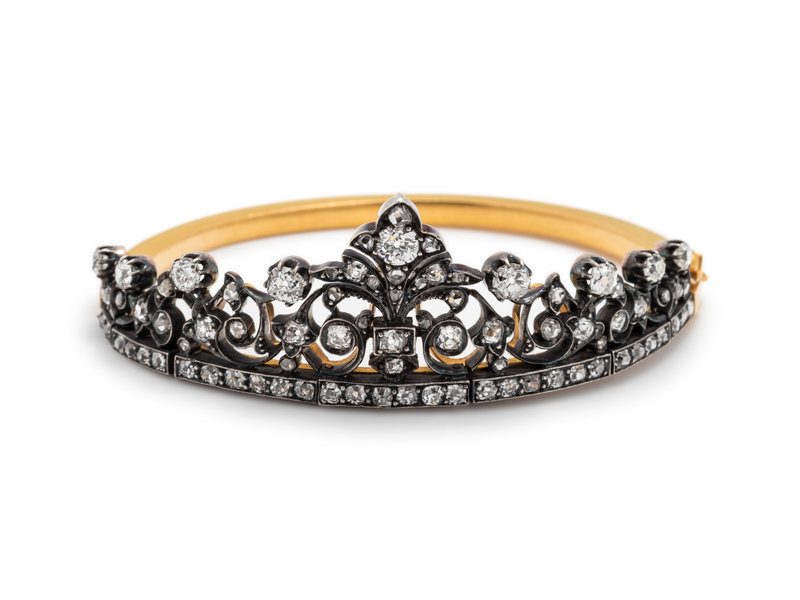 Containing one old European cut diamond weighing approximately 0.35 carat and numerous old mine, rose and mixed cut diamonds. Mounted in silver surmounted on a yellow gold bangle bracelet, hinged with side clasp.