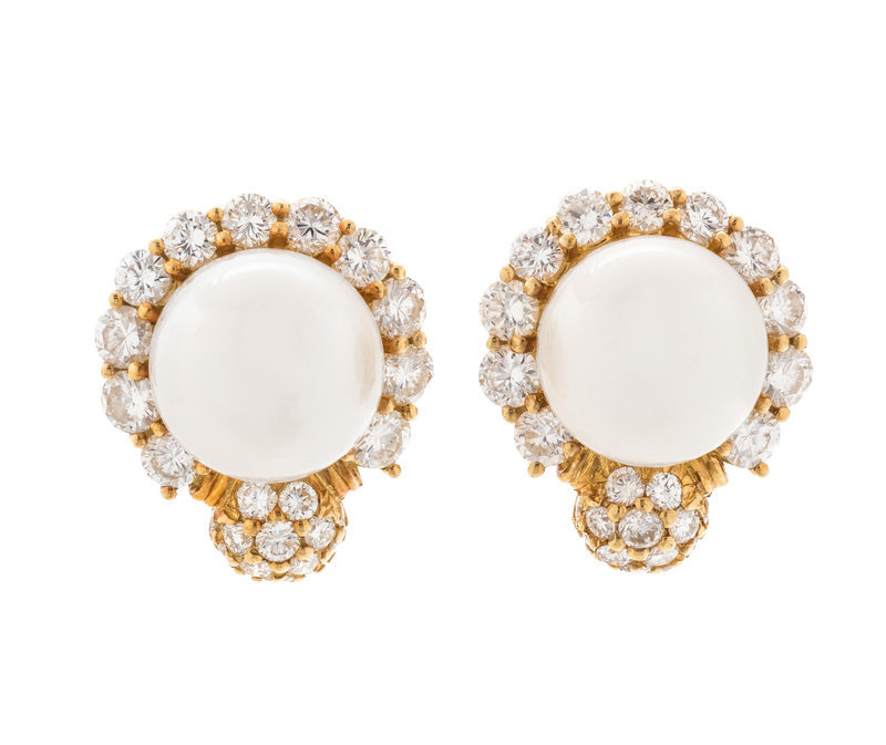 Containing two pearls measuring approximately 13.50 mm in diameter and 50 round brilliant cut diamonds weighing approximately 4.20 carats total. Mounted in yellow gold.
