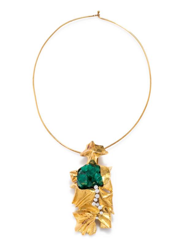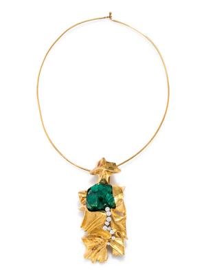 Consisting of a sculptural gold pendant/brooch containing rough synthetic emerald crystals and nine round brilliant cut diamonds weighing approximately 1.25 carats total, suspended from a yellow gold wire collar necklace.