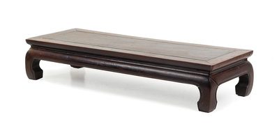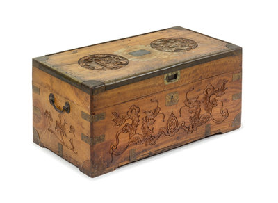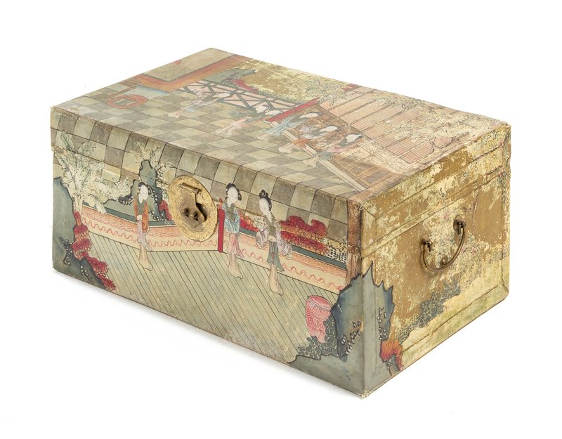 comprising a hardwood low table, one hardwood chest and a painted rectangular trunk.