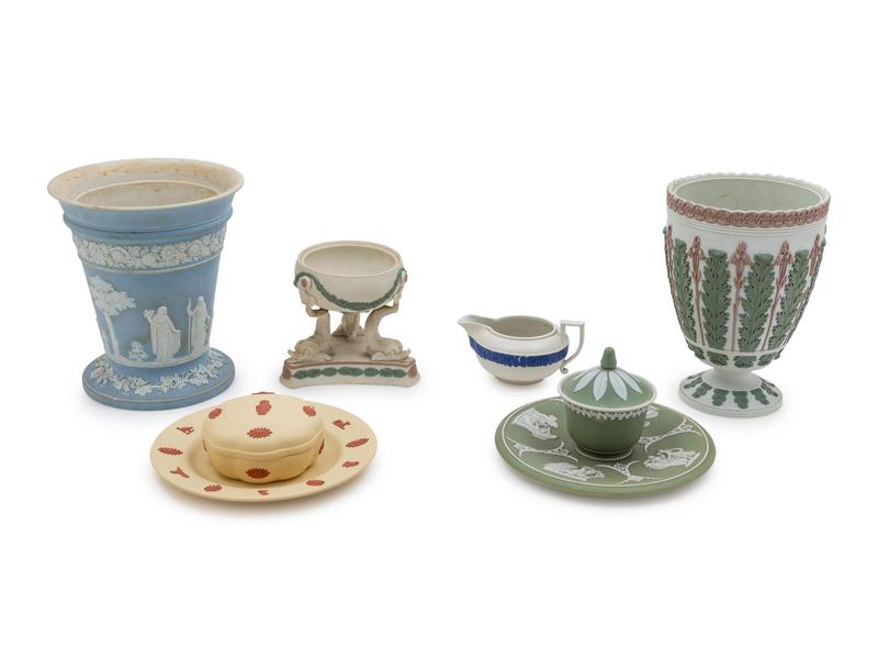 comprising three vases, a covered box and under plate, a creamer, an inkwell and a creamer; 7 total.