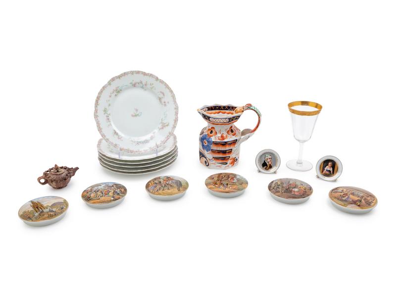 comprising an Imari pitcher, six Limoges plates, six Prattware pot lids, two small portrait plates, a soap stone vessel and a glass; 17 items total.