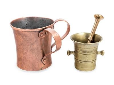 comprising an English pewter mug, and American two handled tankard and a mortar and pestle.