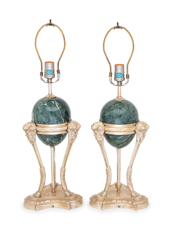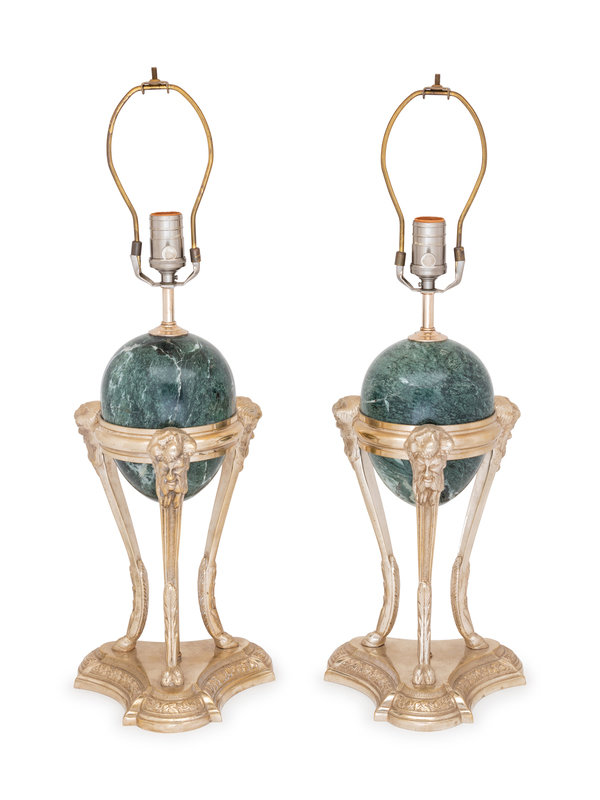 A Pair of Neoclassical Style Silvered Metal and Marble Lamps