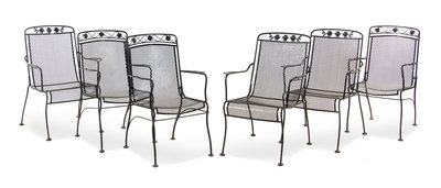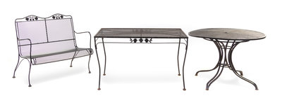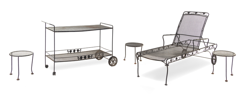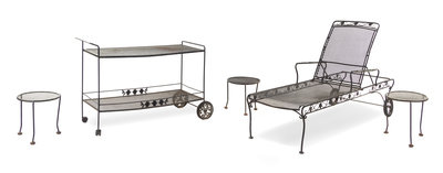 comprising a dining table, a circular umbrella table, a two-tiered serving cart, 12 armchairs, 6 circular low tables, a loveseat and a chaise longue.