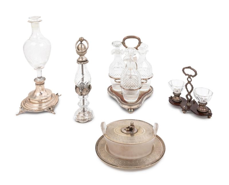 comprising a three bottle cruet set, a covered dish, a bottle on stand and two others.