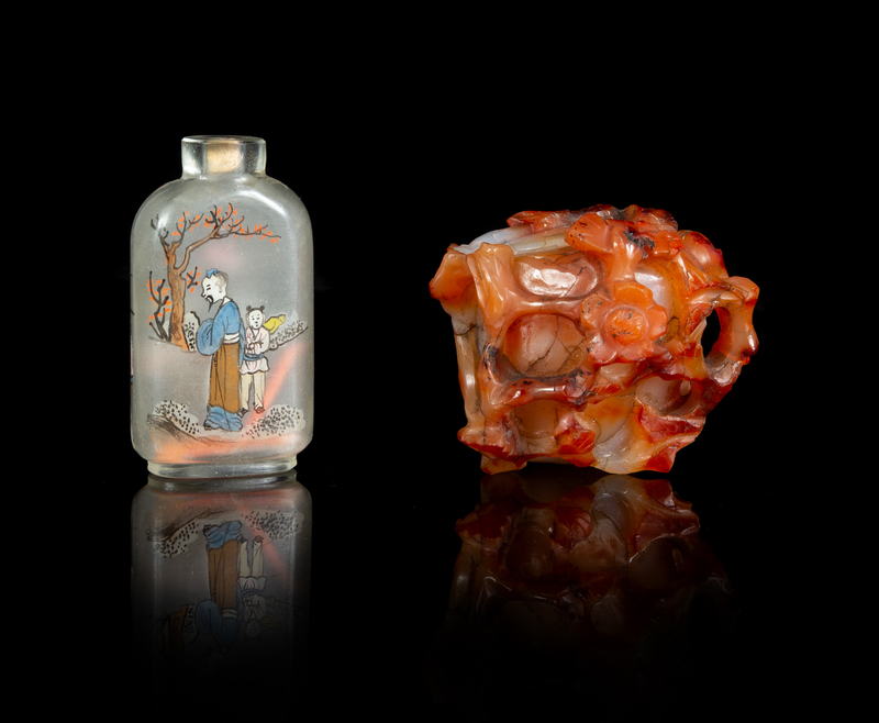 comprising a carnelian agate bottle and an inside painted glass snuff bottle.