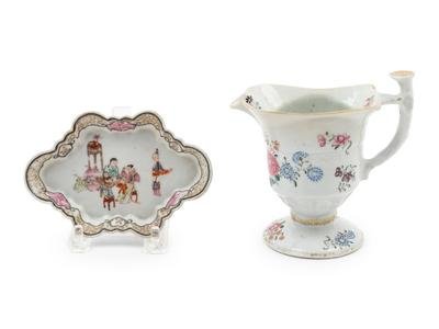 comprising a helmet-from sauce boat with decoration, a floriform dish with floral sprig, a floriform spoon tray decorated with figures an interior setting.