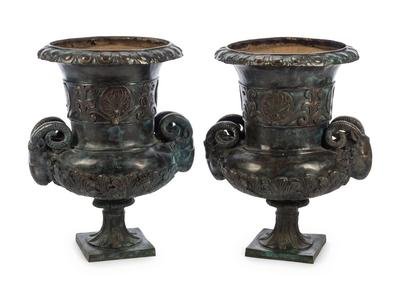 A Pair of Neoclassical Style Patinated Metal Urns