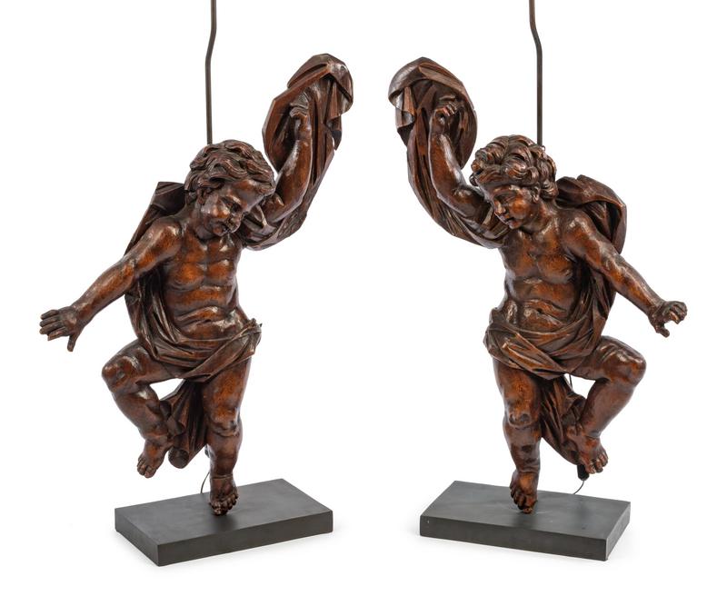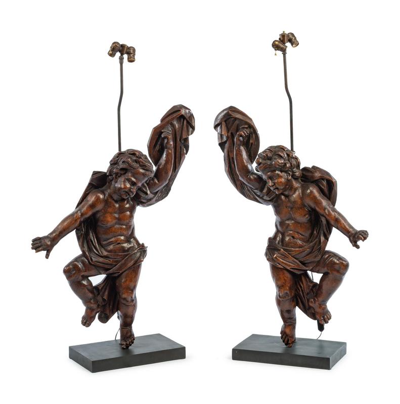 A Pair of Italian Carved Walnut Altar Figures Mounted as Lamps