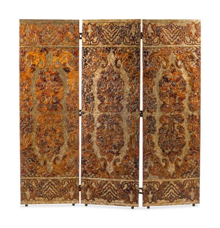 A Spanish Embossed Leather Three-Panel Floor Screen