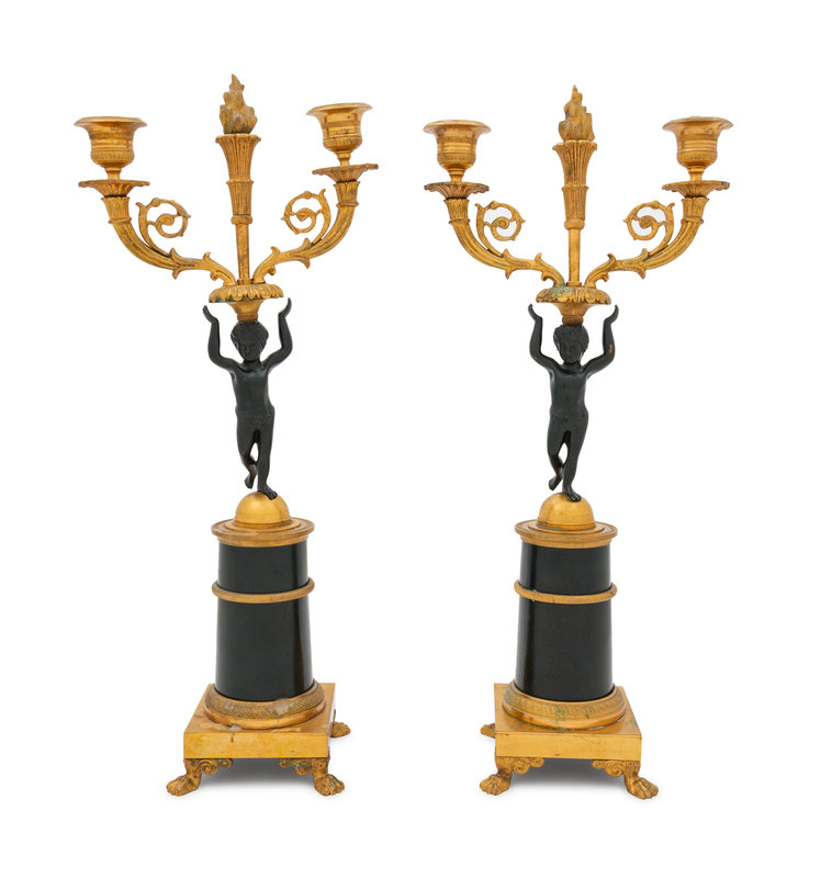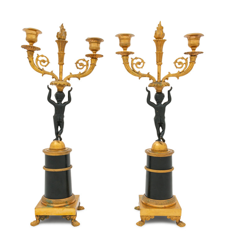 A Pair of Empire Gilt and Patinated Bronze Figural Candlesticks