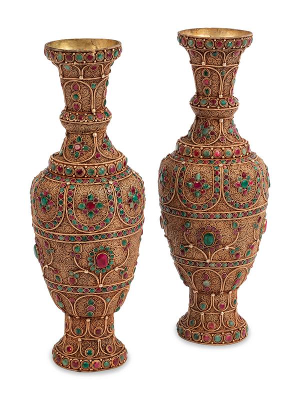 A Pair of Mughal Style Jeweled Filigree Vases