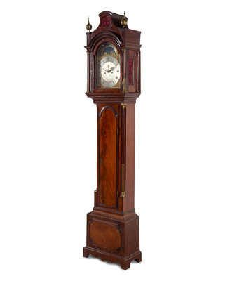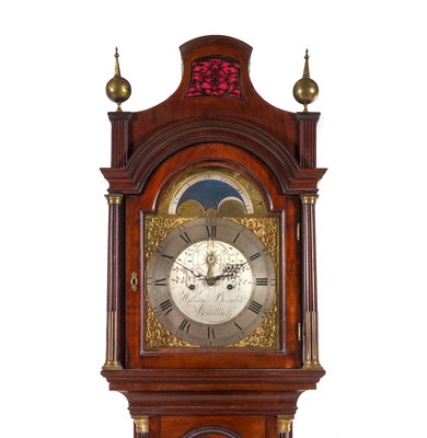 having an eight-day, two-train, five pillar movement with a deadbeat escapement and striking on the hour; with subsidiary dials for date and strike/silent.