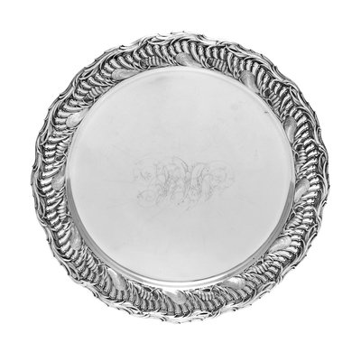 the openwork border worked to show shells and a seaweed rim, centered by a raised monogram.