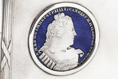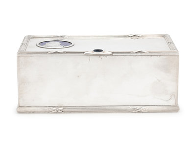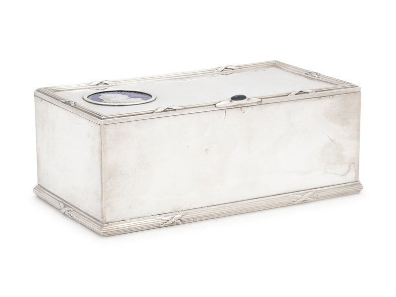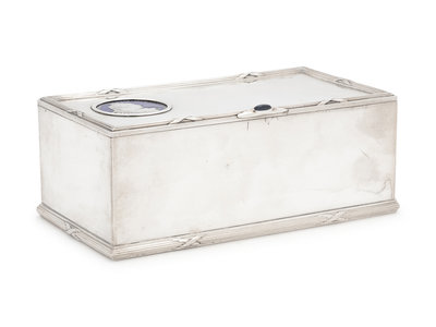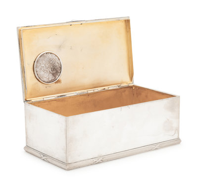 A Russian Silver and Enameled Coin-Inset Table-Top Cigarette Box