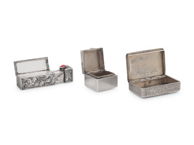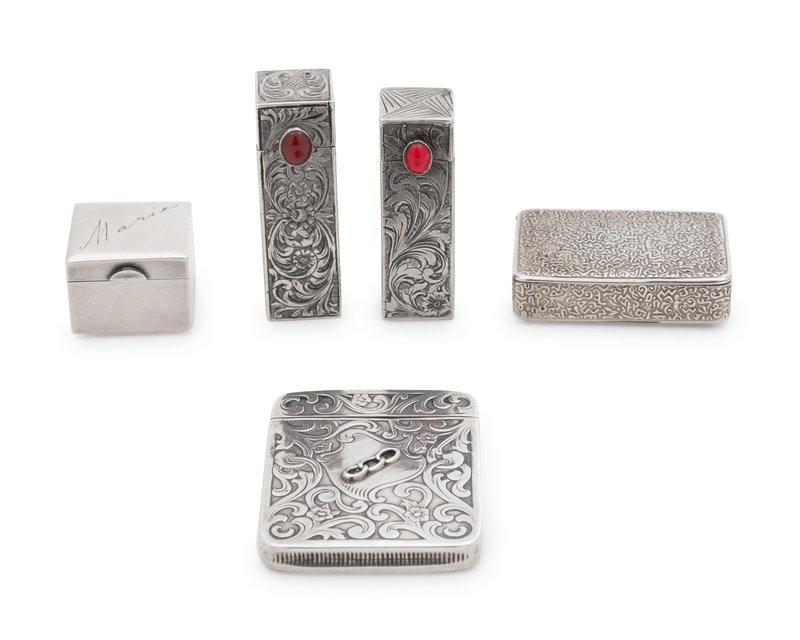 comprising two Russian silver pill boxes, a pair of Italian silver lipstick holders and a vesta case with an International Order of Odd Fellows appliqué.