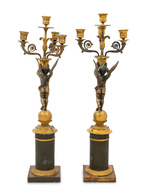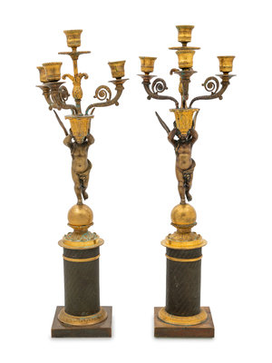 A Pair of Empire Style Gilt and Patinated Bronze Figural Candelabra