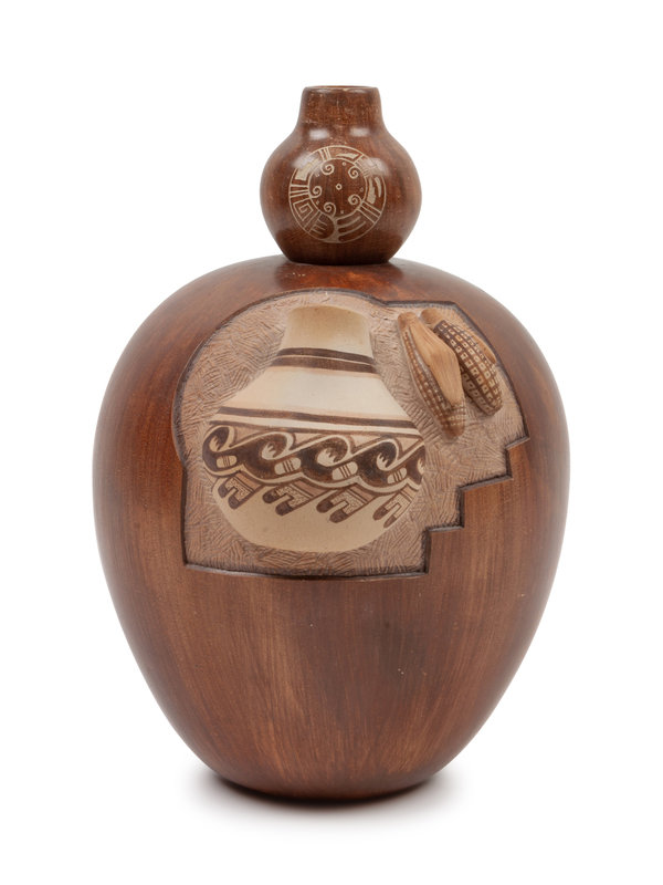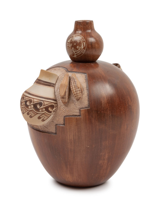 Gourd Form Redware Pottery Jar, with sgraffito lid and handles with pottery and corn in relief and Nampeyo family migration pattern, 1983, signed Tamayo and dated (base)