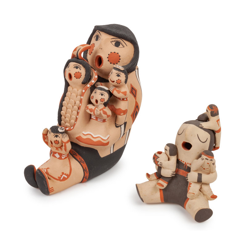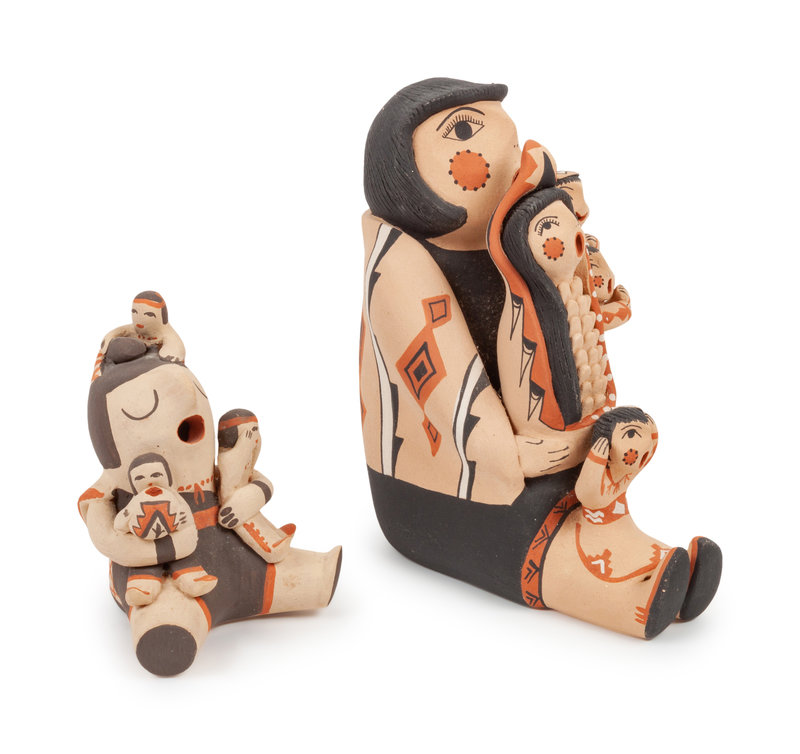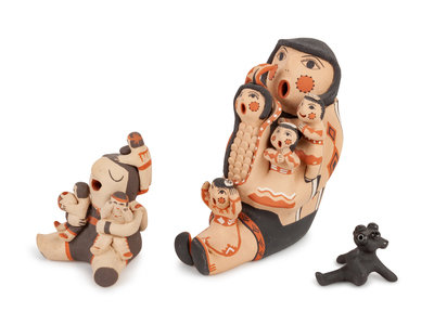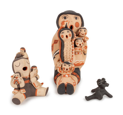 lot of 3, includes the largest by Emily Fragua Tsosie (Jemez, b. 1951); another by Anna Toya (Jemez); and a small blackware figure by Dorothy and Paul Gutierrez (Santa Clara, b. 1940 / b. 1940)