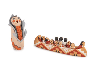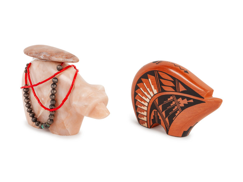 canoe by Anita Cajero, height 2 x length 8 inches; corn figure by Vera Fragua, height 4 1/2; redware bear by G. Sandia, height 3 1/2 x length 5 1/4 inches; stone bear by Matthew Panama, height 4 x length 5 3/4 inches