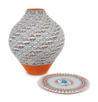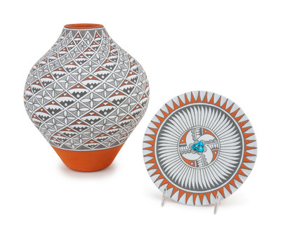 lot of 2, includes a polychrome jar AND plate with turquoise stone; both signed