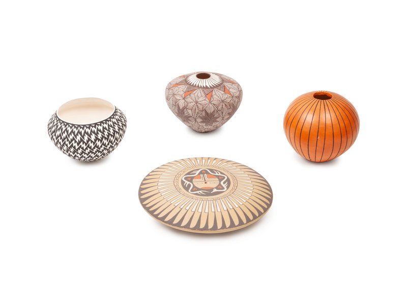 lot of 4, polychrome jar by Sandra Victorino (Acoma, b. 1958); redware with black by Rose Chino Garcia (Acoma); black and white by J. Estevan (Acoma); seed jar by V. Gutierrez (Nambe)