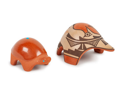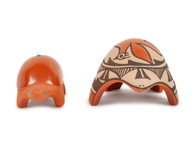 lot of 2. The larger turtle is signed Elizabeth Medina. The smaller turtle is initialed RJ.
