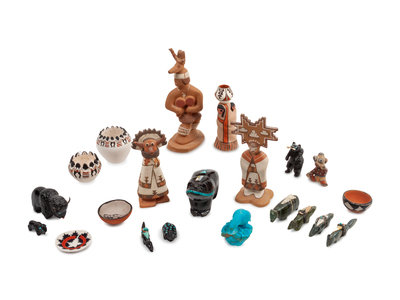 group of 20, includes eleven Zuni fetishes, nine pieces of Pueblo pottery miniatures, including signed pieces by N. Root (2) and M. Simpson; and a miniature Navajo wedding basket