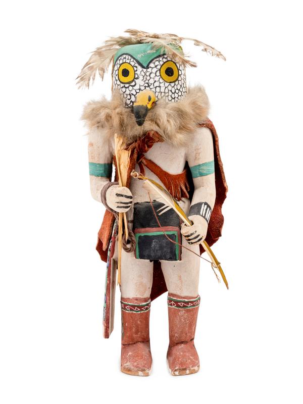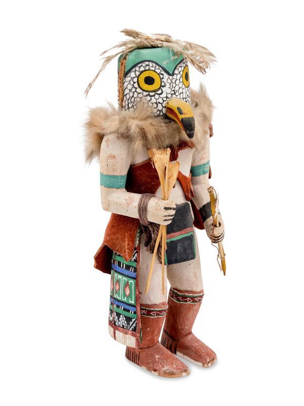 A Group of Three Katsinas including Wood Carrier, owl, and doll with case mask with protruding eyes and snout