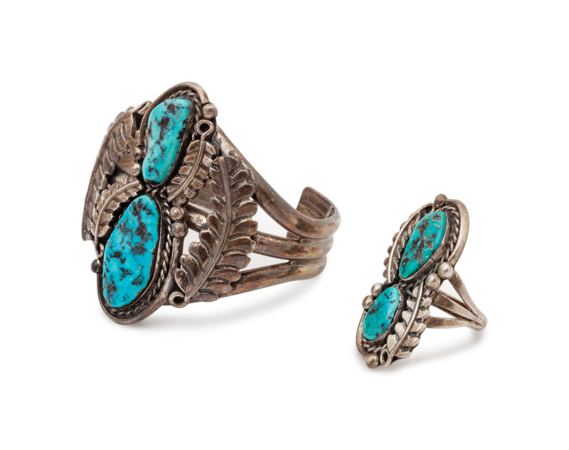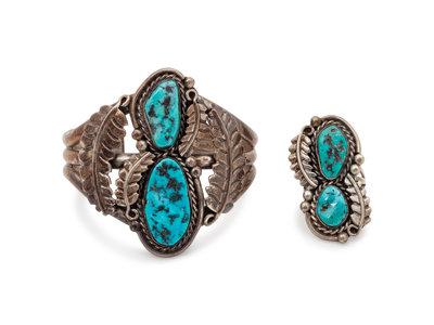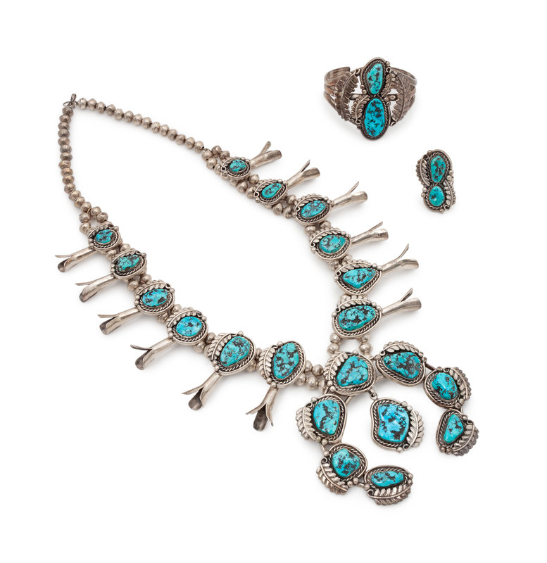 Navajo Silver and Turquoise Squash Blossom, Cuff Bracelet, and Ring Set