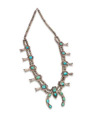 Navajo Silver Squash Blossom Necklace, with Turquoise Cabochons in Rope Bezels